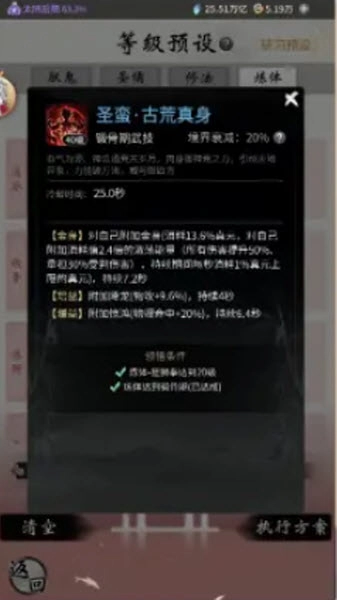 3、刷怪:推荐蛮相:新版体修的群伤对比老版略有加强,但是人界单修体的话,群伤还是不够的,神相镇狱在蛮相状态下单体变群伤,可以多一个双目标技能;同时因为圣相蓝耗更大不利于刷怪;目前人界的群伤技能是3目标的大荒魔决、残阳三杀戟和双目标的伏魔一指、神相镇狱(蛮相)、狂狮拳。