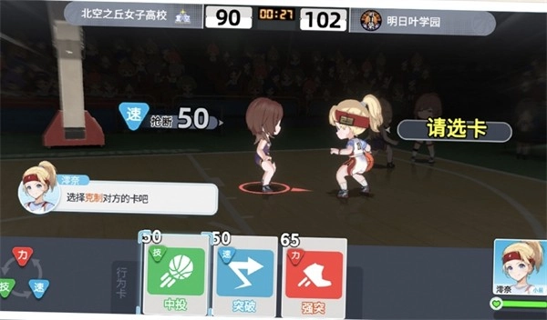 在游戏的比赛中,作为教练可以选择行动牌决定球员行动,利用不同属性的克制关系与对手进行博弈。无需复杂的操作,都可以让篮球少女进行一系列富有观赏性的扣篮、突破等操作!