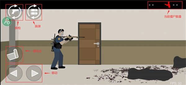 4、左下角是左右移动、上面一点是腿攻击、左上角是换枪、旁边是换弹。