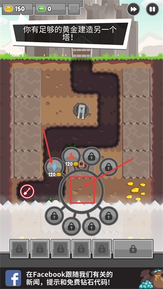 2、关注左上角金币数量,在地下路径中收集金币的同时,抵御绿色敌人的进攻,积累资源为后续塔的建造做准备。