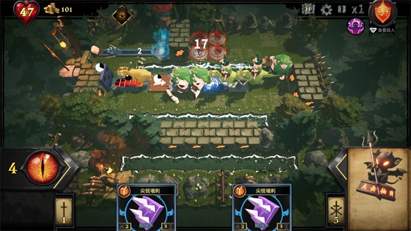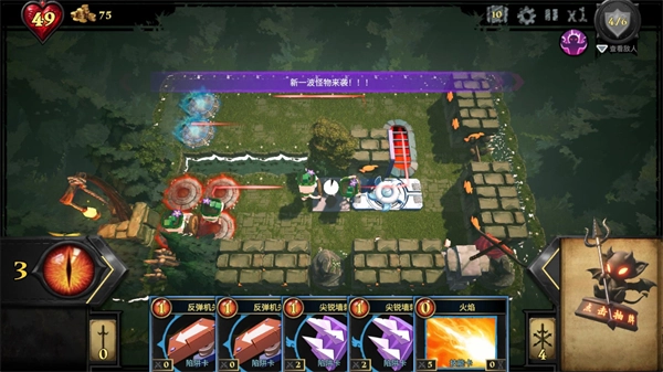 4、正式开始后怪物会从红色区域出现,并前往蓝色区域,当角色进入陷阱范围会后陷阱会自动进行攻击,消灭敌人可以获得魔眼来使用新的卡牌。