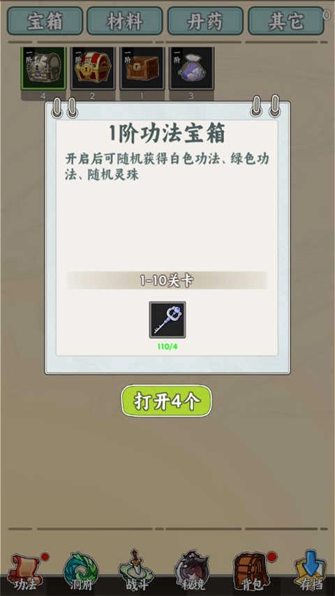 5、通过获得的宝箱奖励,获得各种功法技能,提升自己的战斗力和修仙能力。