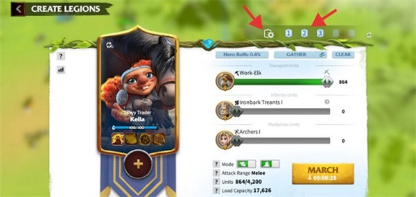 位于屏幕左下角的主要圆圈按钮,我们用来进出城市,也有4个隐藏功能。您可以使用它们直接跳转到世界地图上的特定缩放级别。为此,您必须按住按钮一秒钟,然后会弹出4个功能。从上到下,前两个将直接跳到世界地图上最高级别的缩放。然后您可以使用左侧的选项仅查看特定元素,例如道路、联盟资源、标记等。总的来说,这是一个很棒的功能,可以更好地查看地图上现有的资源点、敌人、盟友和其他元素。4、创建军团预设Legion Presets 可以为您节省大量时间,因为您将能够准备多支具有不同部队和指挥官组合的军队,并保存它们以备将来使用。例如,你可以创建一个拥有强大PvP指挥官的军团,有或没有副手,以及最适合这种情况的最高级别单位。或者,一个专门为采集而生的军团,英雄拥有采集天赋和运输单位。