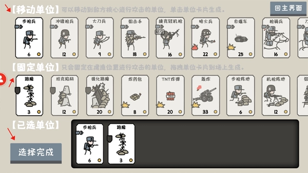 2、接下来点击“遭遇战”,玩家需要进行单位组合:移动单位和固定单位,移动单位是可以移动到敌方核心进行攻击的单位;固定单位是只会固定在建造位置进行攻击的单位,选择上方移动单位和固定单位,选好后点击“选择完成”。
