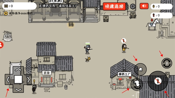 5、左边的就是角色的移动方向键,用来控制小士兵移动的方向,右边就是角色的功能键了,有一个方向指向的图标就是用来翻跟头的,通过翻跟头来躲避敌人射出的子弹;小石子图标就是投掷小石子,这个是没有限制,无限补充;右边显示数字的图标就是用来切换武器,目前的武器搭配就是步枪和大刀;中间最大的子弹图标就是用来开枪的功能。