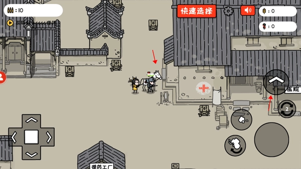 6、玩家跟着红色箭头指引找到一匹马,靠近马右边会自动显示向上的箭头,用来上马。当你想下马同样点击右边的向下方向键即可。
