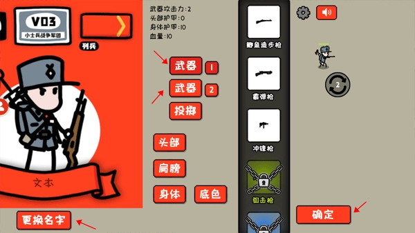 7、继续介绍主界面中“装备”功能键,这个就是用来设置角色的各种信息的,像更换名字、武器1和武器2的搭配、头部、肩膀、身体以及底色的设置,设置成功后点击确定即可。