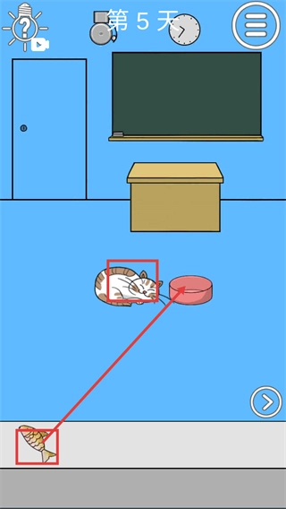 3、切换到教室场景后,将【鱼】放入猫咪的食盆,吸引其注意力,创造通关条件。