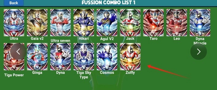 5、点击主页的右上角有融合攻略可以查看,每个奥特曼之间融合的特效都不一样