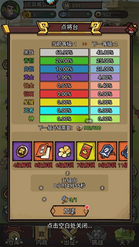 3. 努力发展并壮大自身的城池,通过合理运用各类物资来提升建筑物的等级。