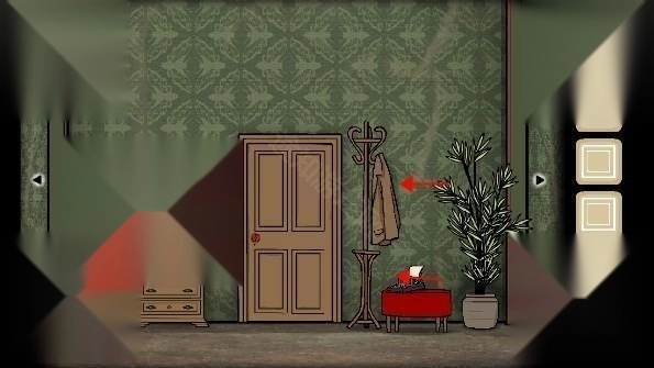 3、打开左边的盒子获得「钥匙」,移动旁边盒子上的方块到正确的位置,打开盒子后获得「照片碎片」,点击镜子穿上大衣,出现女人后来到门口