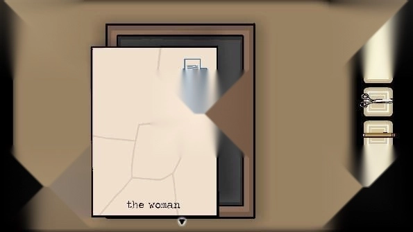 5、将五个碎片全部放在相框上获得提示「the woman」(中间有一个空格),点击打字机输入英文后出现一张纸,用铅笔涂抹纸上出现的男人、门、女人等,最后涂抹钥匙图案获得「钥匙」