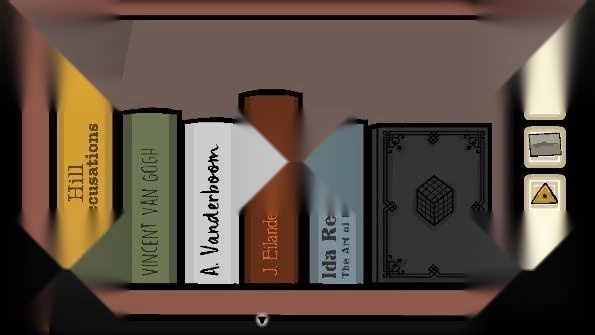 13、点击两次钥匙孔后出现眼睛,观察眼睛上的图案位置,转动时钟的指针至十二点四十五,打开暗格后获得「三角形钥匙」,用钥匙打开右边的抽屉获得「胶片2」和「手帕」,打开左边的抽屉是各种文件夹,里面有书架上摆放书位置的提示和一个「文件」