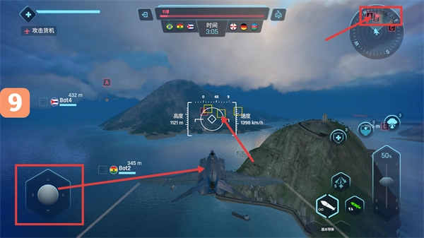 2、通过左侧操作区域控制飞机,依据右上角罗盘【A-B-C】标识瞄准敌人,结合高度-速度数据精准接近目标。