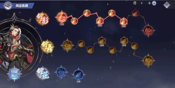 红色分支“剑影”:更聚焦于PVE副本,其中关键为第1个节点下需要由3个专属魂骨的星级效果才能激活的快速输出能力,这个有点类似于“先机”的效果了;接着是第4个节点下的“极道·七杀束缚”效果,其可以开启领域效果;最后则是第6个节点下的“三相剑墟”效果,其可以大幅提升开启领域后的伤害。