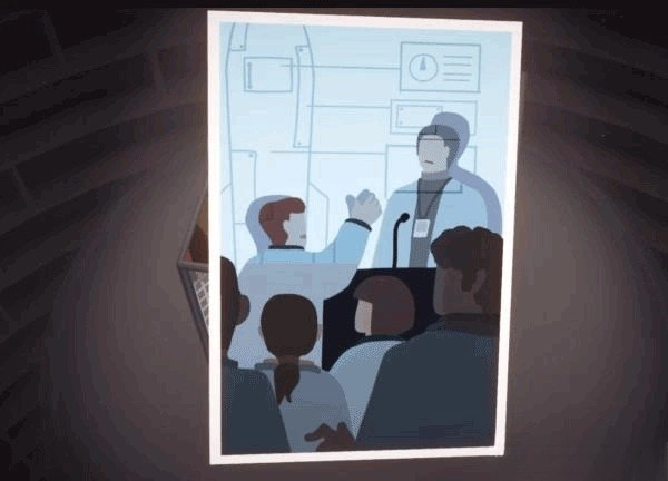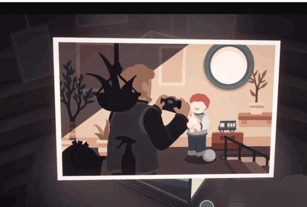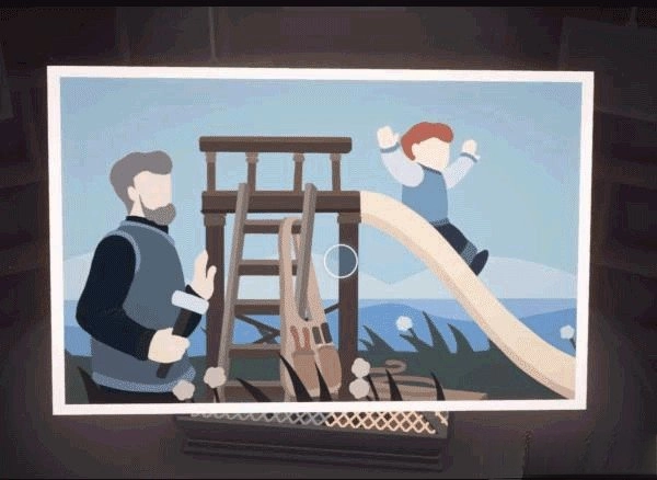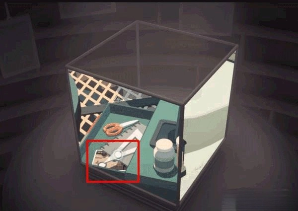 利用桌子上的台灯进行拼接,从而将仓库门前地面上的井盖抬起,打开立方体上部的画面。随后在左立面中的滑梯下方可以找到该照片。
