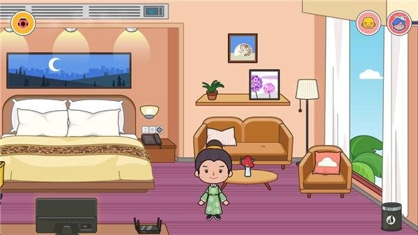 三层:大床房,房间内的电视机、洗漱区、冲凉区等设施均可与角色互动,如让角色洗漱或看电视。