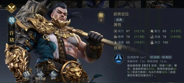 许诸配备宝物:铁卫重铠,虎卫兵符(亦可选嗜血刀);兵种大刀兵,战法一鼓作气。
