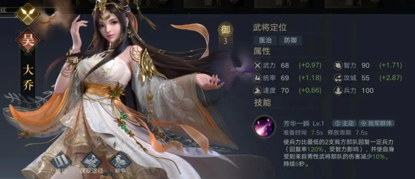 大乔配备宝物:天子冕,镇军印(亦可选金疮秘药);兵种铁甲兵,战法坚守营地。