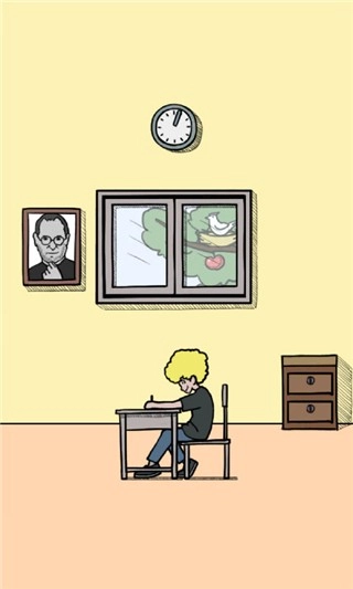 先捡起右边的拖把并放在墙上的照片上让其变成棍子,在等小伙子伸出看答案的一瞬间点下去即可。