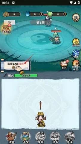 1、游戏上手极为简单,进入界面后只需按照提示进行点击,带领你的天师一路通关,逐层挑战,点击画面中的【通关第1层】即可进入任务挑战。