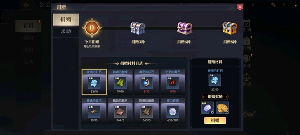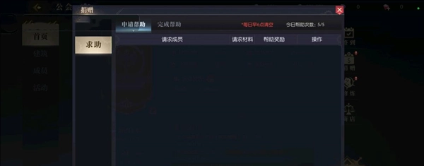 3、完成6次捐献任务后,如果缺材料才能到8次,可以发起求助,请求公会好友捐献材料,加一个活跃的公会很重要