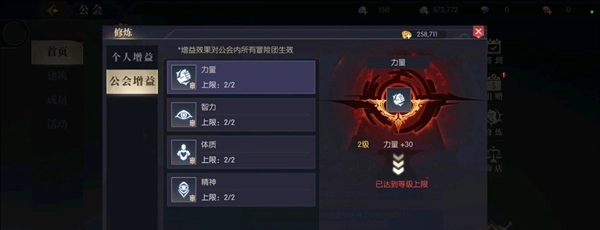 4、公会修炼,分为公会增益和个人增益,公会增益仅会长可以升级,提供四维属性,对所有公会成员生效,公会等级越高,增益等级上限越高,个人增益可以提供更多的属性增加效果,玩家需要消耗贡献币和银币升级