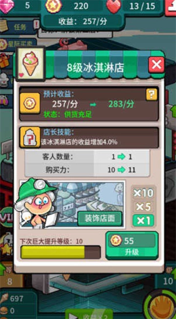 游戏的经营主要涵盖店铺等级、生产线、运输线与店长这几个方面,前三者均能通过消耗金币提升等级以优化效益,而招募的店长所具备的技能也可使店铺收益得到加成。