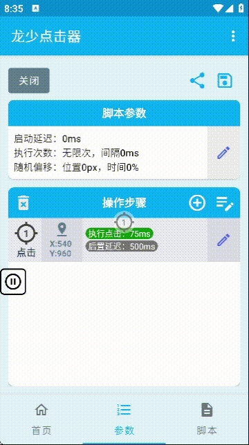 3、自由设置点击频率、位置和循环次数,还能录制手势保存为脚本,方便下次一键启用。