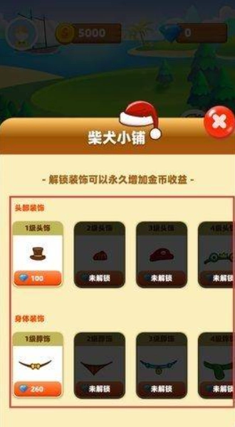 4、进入柴犬小铺,用钻石解锁头部、身体装饰,装饰能永久增加金币收益,让养成更有趣。