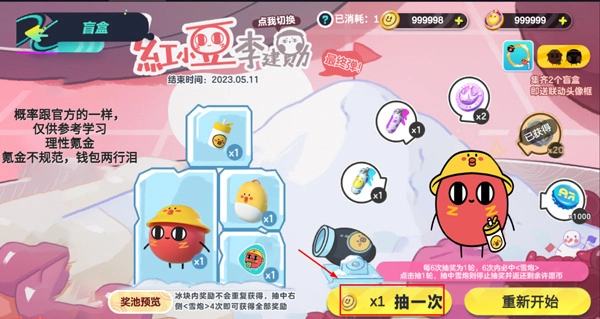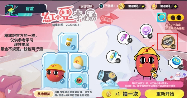 3、当右侧5个物品全部抽齐后,可解锁冰块中的红小豆;