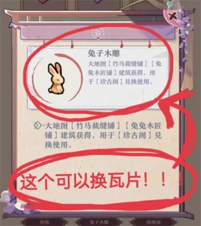 20个对应人物的招揽=1个兔子木雕=2个瓦片