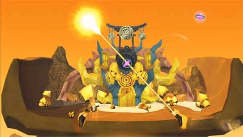 头部变成普通气球后用地上的两个石刀把气球扎破,这样气球会变成三个水晶体围着全场飞,只要安心的躲过就好。随后水晶体的其中一个会固定在上空使出射线攻击你,等待水晶发射三次射线后利用太阳射线打掉水晶即可,后两个水晶同理。只要打掉三个水晶体就通关啦!