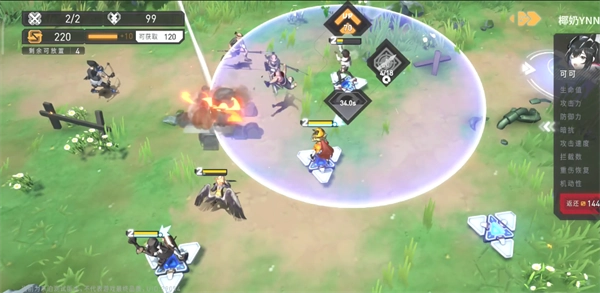 4、第三波的时候左边会来一个小型boss,粉毛就放素养,然后星栀技能套盾,解决boss之后,把粉毛放到克莱右边,同时右边会来小boss,极乐开启素养进行攻击,等boss到粉毛旁边,可以艾雯开启技能群体套盾,等boss技能放过之后,把极乐放在左边的高台上,开启技能,清杂。