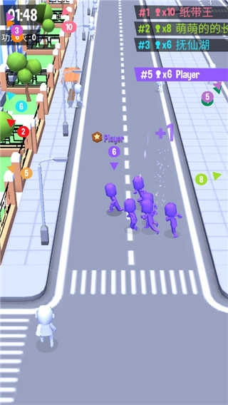 6、多人在线实施对战,真人玩家实力pk,玩家需要把分散的人群组合到一起,扩大自己的队伍,跟来自不同地方的玩家展开对战,玩家需要在最短最快的时间内聚集人群,去攻击和吞噬其他玩家,获取最后的胜利
