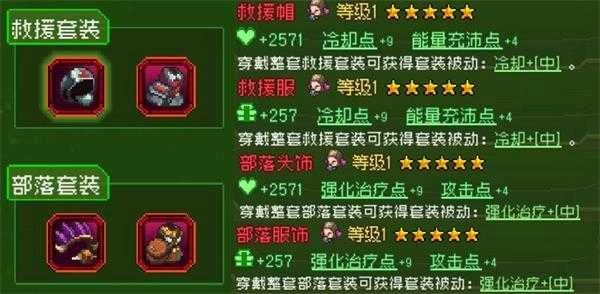 穿戴整套【部落套装】,可以获得“强化治疗+【中】”效果,中等幅度提高友方队友的攻击力。配合群奶武器,队友全程几乎都处于攻击力增幅状态,通关更加轻松。