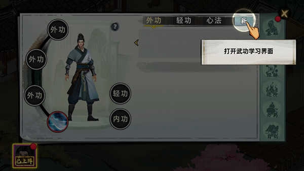 4、玩家可以通过武功界面学习新的武林绝学,后期还可以学习轻功、外功等各种武学。