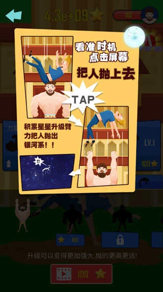 2、简单的游戏玩法,点击大力神手臂上的男人,就可以抛向天空。