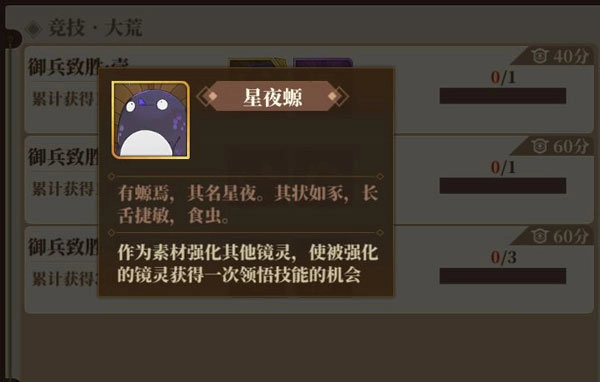 10、星夜螈:这个就很重要了,关系到你镜灵技能升级,它可以作为材料给你的镜灵升级技能,SSR食用最佳,另外最好给技能升级后有质的变化的镜灵:如共工、宵明、魃这些技能升级后就会有不同程序提升的,在前期资源匮乏的情况下,不建议给:如九尾、常曦这类只加伤害或奶量的镜灵。