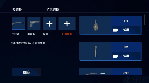 5、扩展装备:选择主武器、副武器、投掷武器以及其他扩展装备,完成后点击确定;
