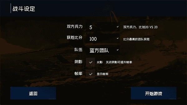 4、手动调整双方兵力、获胜比分,所在队伍阵营等,接着点击开始游戏;