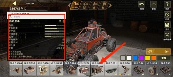 玩家在改装页面改装战车,左上角是你选择的配件的相关数值,下面是你可用的配件和配件的战斗力,通过合理搭配打造出你的最强战车