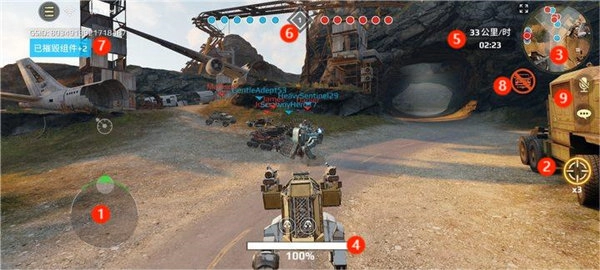 9. 队友沟通按钮玩家操控战车,跟随队友前往地图中心战斗,战车可以手动或者自动前进,将准星标准敌方自动射击(PS:远程战车不同,需要点击开炮),与队友配合将敌方所有战车击杀即可获得胜利