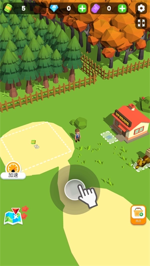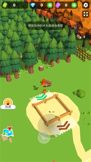 2、在这里你将作为一名小小的木材商人,你需要先为自己准备大量的木材,首先建造仓库,然后与工人一同伐木获取材料。