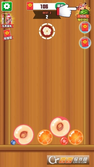 3、两个相同的水果就可以合并,类似于2048的经典玩法,直到合并出一个大西瓜为止。