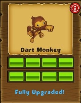 (每发飞镖可以攻击2个气球)→(每发飞镖可以攻击3个气球)→(每次可以发射三枚飞镖)→(增加“变身”技能,把攻击范围内的飞镖猴变成超猴)