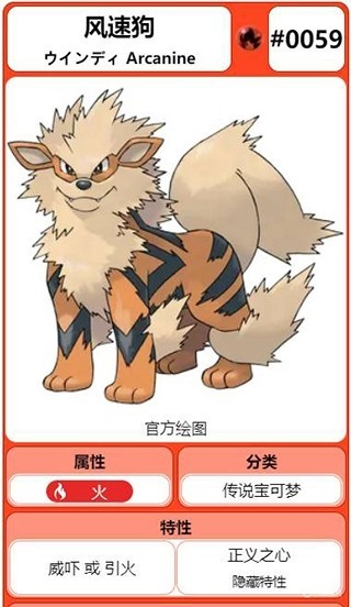 火属性宝可梦,而洗翠的样子是火属性和岩石属性宝可梦。洗翠风速狗会将猛烈燃烧的火焰缠绕在牙齿上扑向猎物。虽然体型很大,却能以灵巧的假动作戏弄敌手,那姿态就像是舞蹈一般。