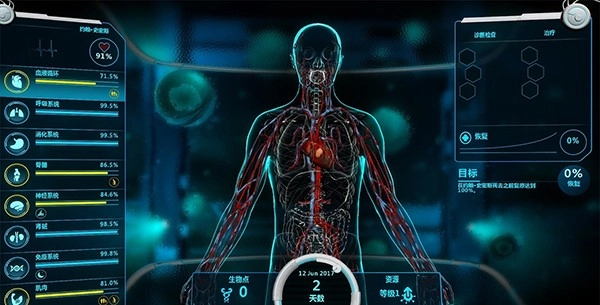 进入透视图,立马可以看到病人的健康状况以及各类初始buff,例如骨骼右下方的黄色负面buff 与神经系统左下方的蓝色正面buff。根据很多负面buff其实可以大大的帮助玩家判断病情方便诊断。而这个病人可以看到,已经成年并且步向老龄,机智的笔者立马意识到,病人的骨骼和肌肉虽然健康值也在下降,但很有可能是病人年龄过大造成的,非疾病影响,因此接下来诊断应该侧重于神经与血液系统。