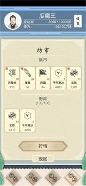 2、中前期:恭喜你,正式进入该游戏的经商倒卖阶段。这个阶段最大的收益就来源于坊市货物的低买高卖,运气好的话会猛赚一笔,会很爽。小小的坊市也体现了炒股的很多思想,府库里最多存5种商品,坊市里一次刷新也最多有5种。