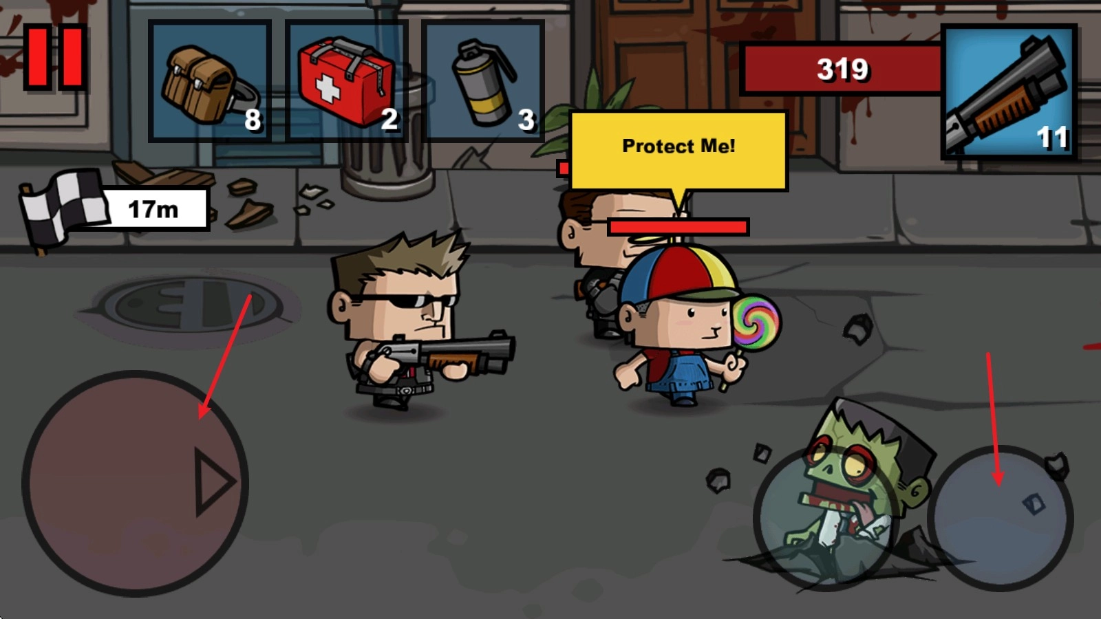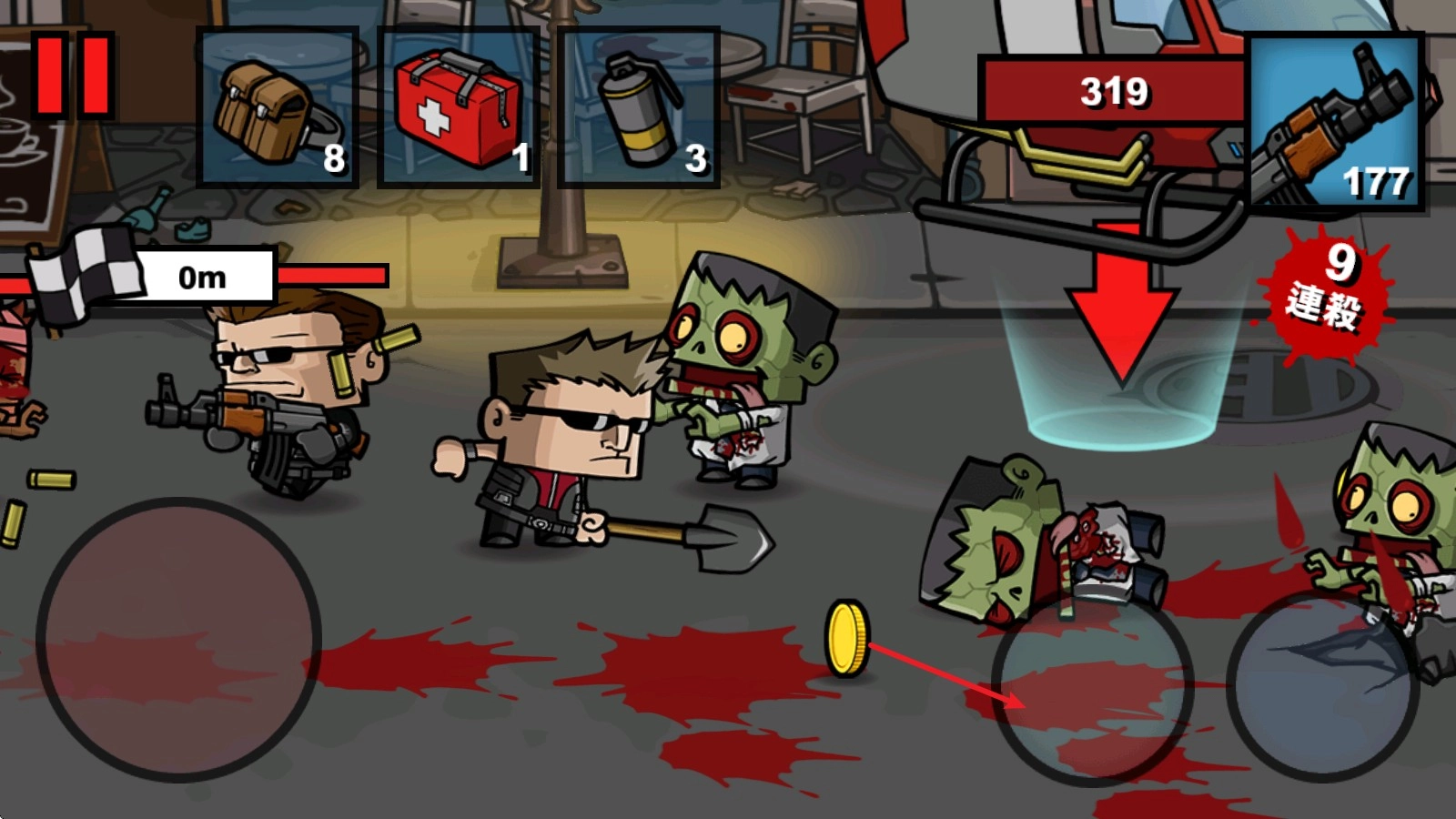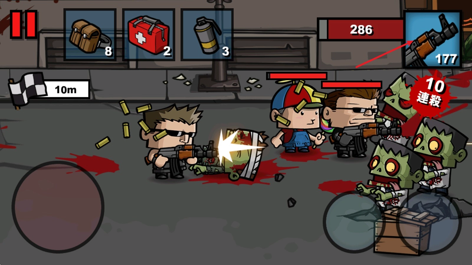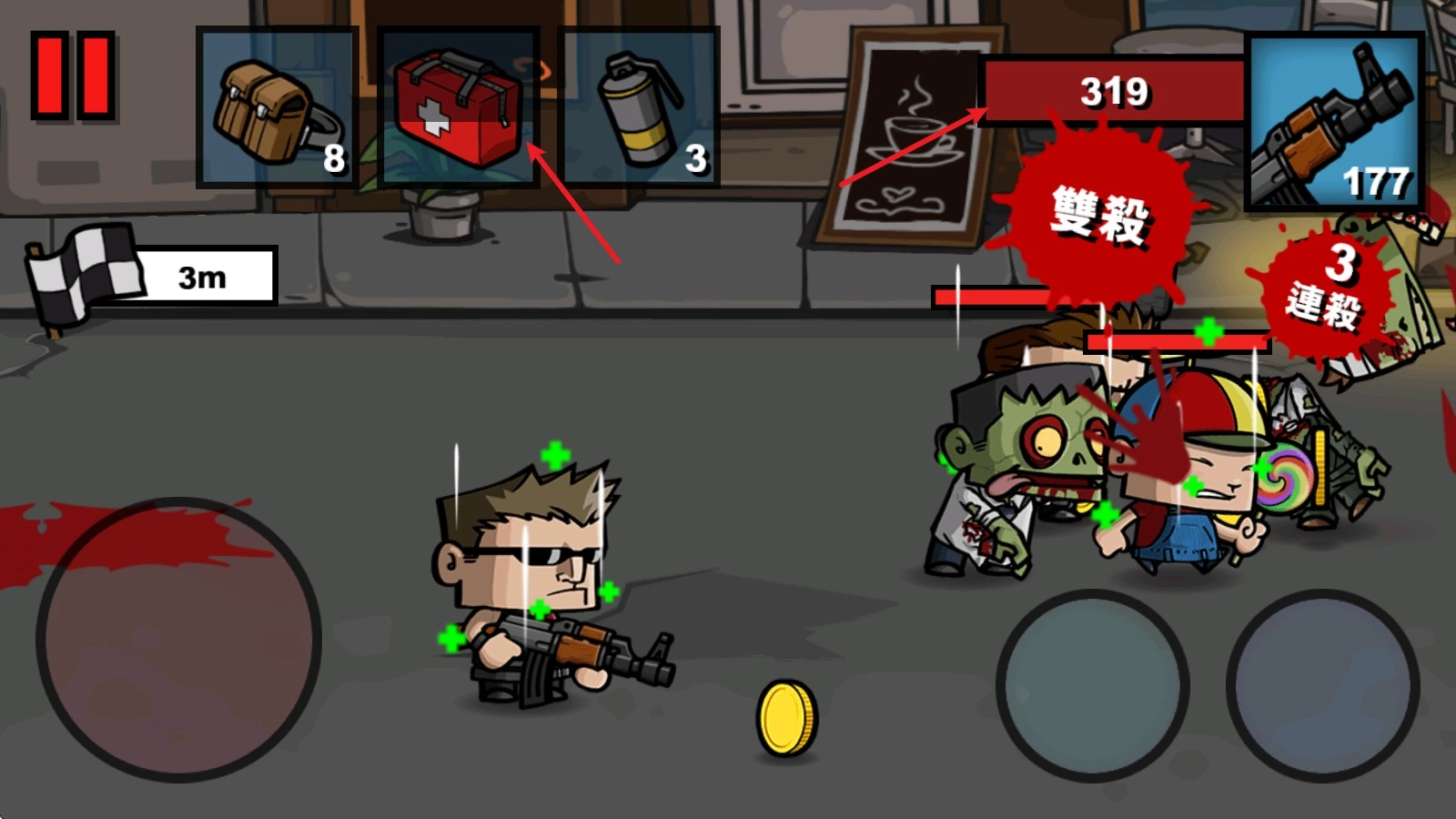 4、战斗中被僵尸击中就会掉血,可以使用左上角的医疗道具来回血。